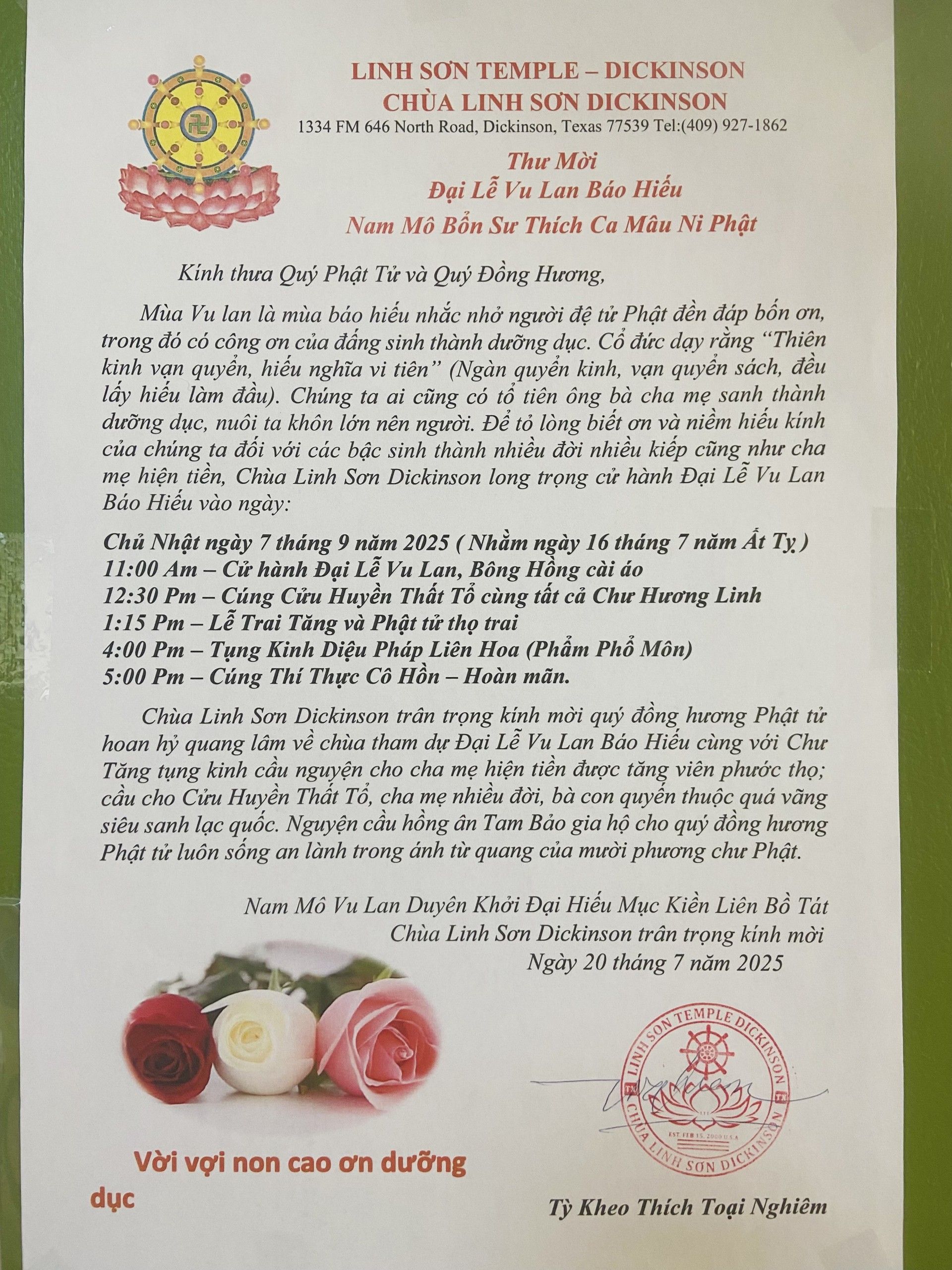 THƯ MỜI ĐẠI LỄ VU LAN 2024